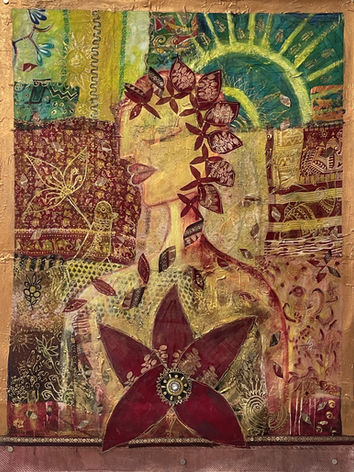 I attempt to tell a story of renewal and hope through this Fiber Artwork. After my cancer journey, I found myself drawn to the idea of blooming from broken ground—how beauty and strength can emerge from the most challenging places. Click below to see enlarged view and details